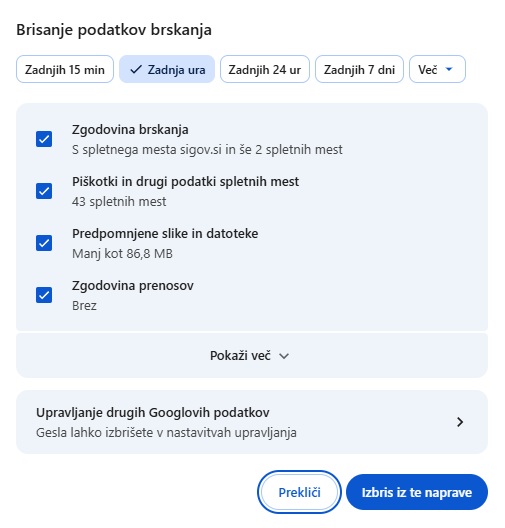 Odpre se vam okno Brisanje podatkov brskanja. Priporočamo, da pobrišete piškotke zadnjih sedmih dni.